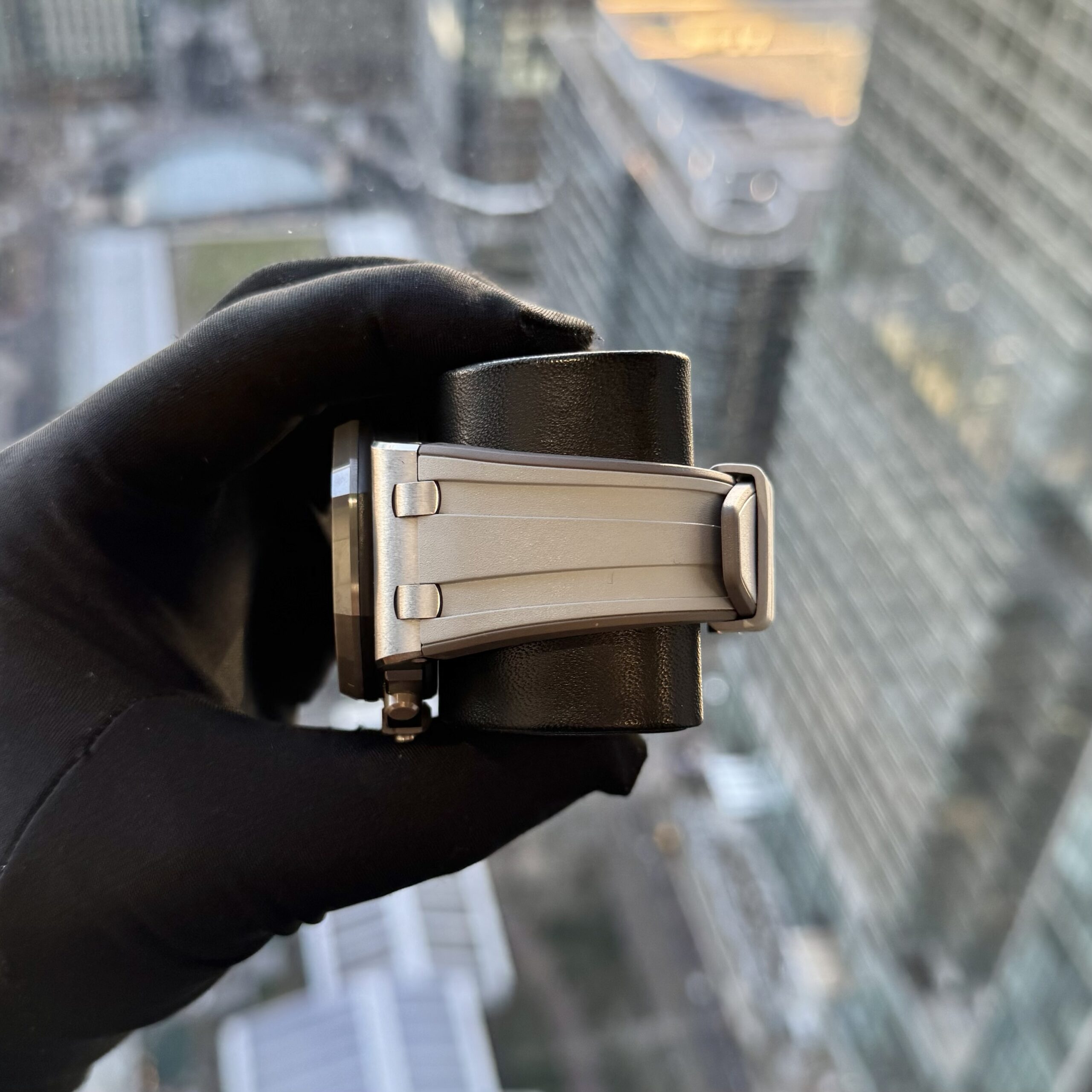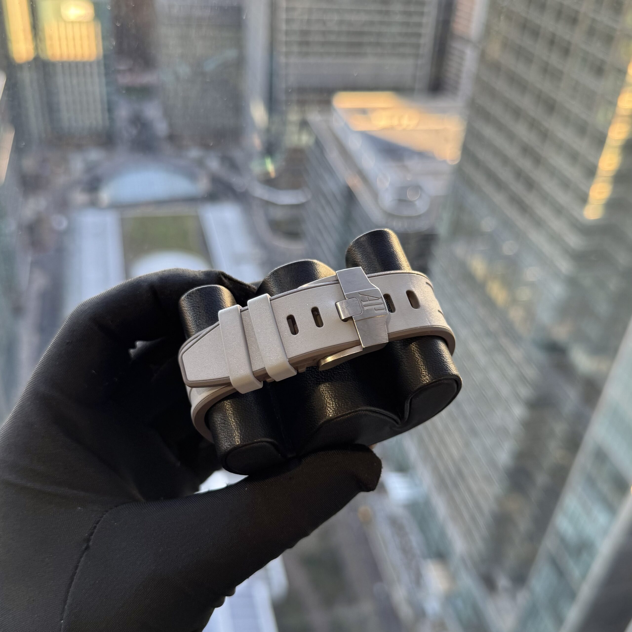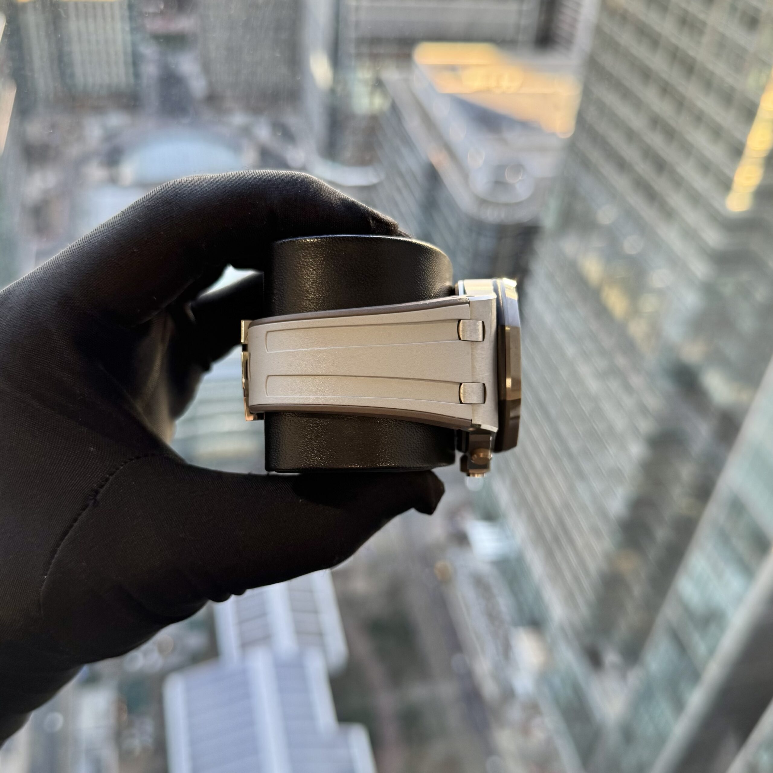 Audemars Piguet Royal Oak Offshore 42 mm “Ghost” Chronograph — a stealthy and bold take on the iconic Offshore chronograph. This 42 mm titanium case model features a muted slate-grey “Méga Tapisserie” dial with contrasting sub-dials, Arabic numerals, and luminescent white gold hands for clear legibility. The grey ceramic bezel and pushers blend seamlessly with the grey rubber strap for a cohesive monochrome aesthetic. Powered by Audemars Piguet’s automatic Caliber 3126/3840 with a ~50-hour power reserve, it offers a 12-hour chronograph and date function — all wrapped in a lightweight, robust package that’s quietly striking on the wrist.