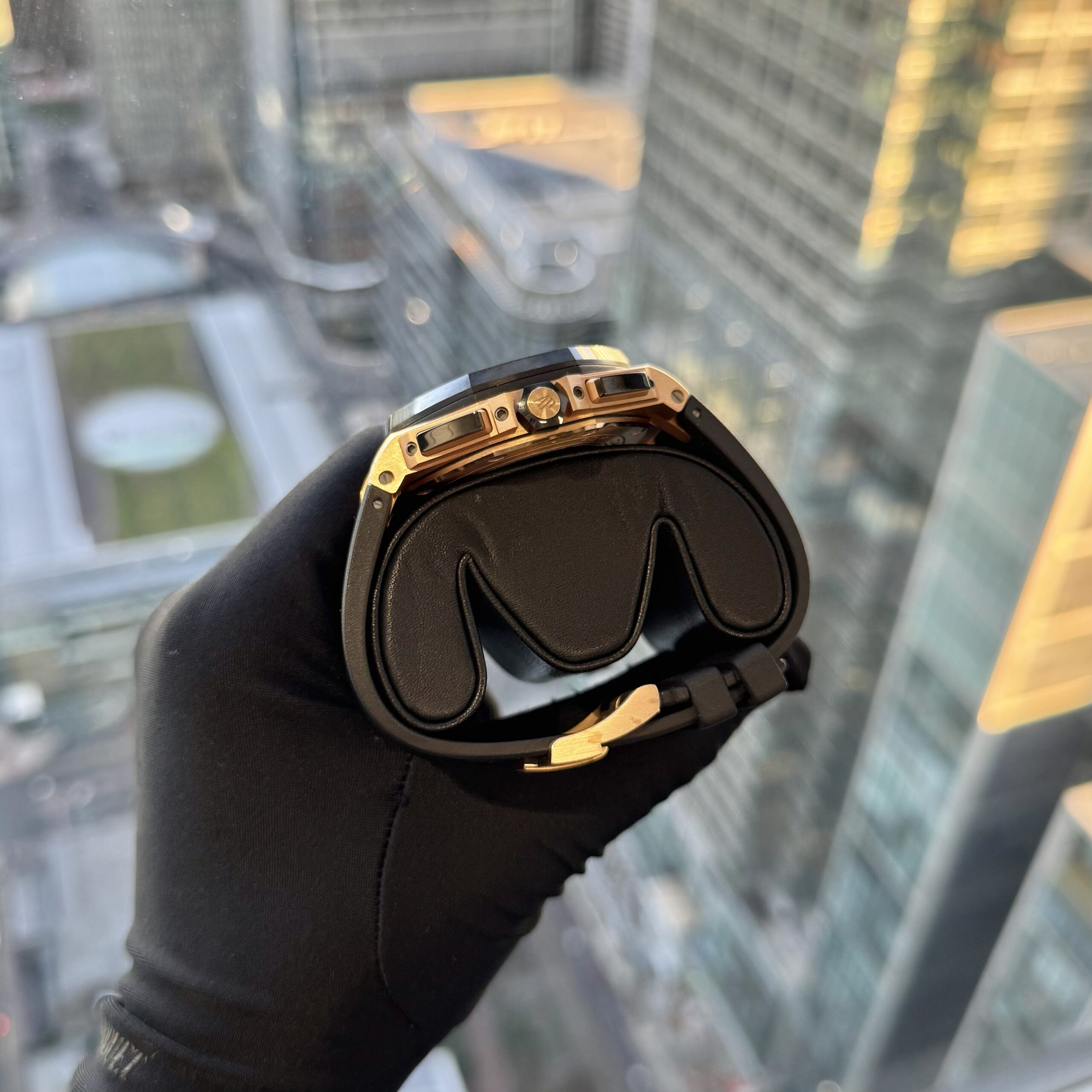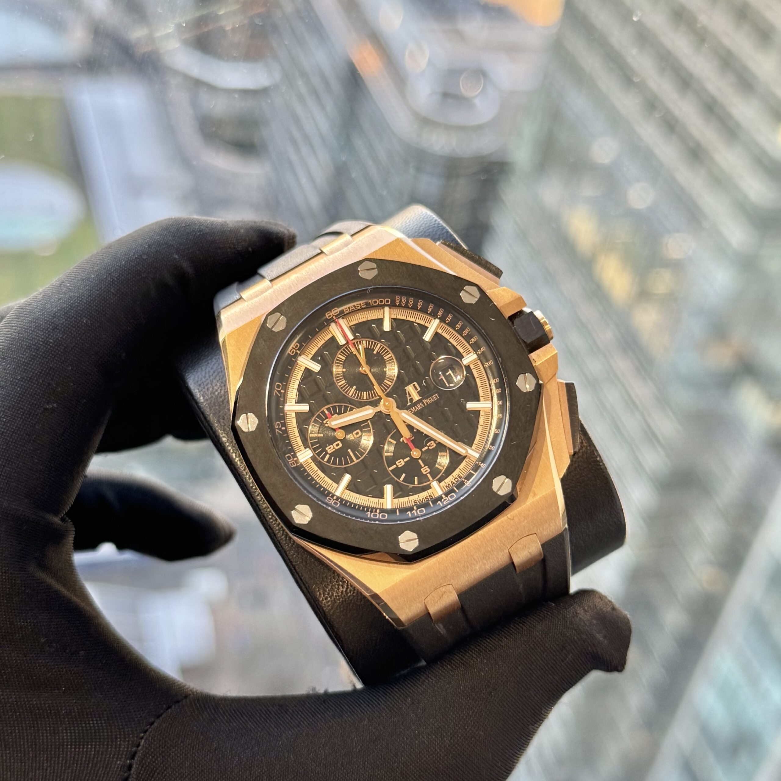The Audemars Piguet Royal Oak Offshore 44mm Rose Gold Ceramic Bezel is a bold statement of power and prestige. Crafted in luxurious rose gold and accented with a striking black ceramic bezel, this 44mm timepiece blends refined elegance with rugged performance. Its iconic octagonal design, precision chronograph movement, and commanding wrist presence embody Audemars Piguet’s legacy of innovation and craftsmanship — built for those who appreciate uncompromising style and mechanical excellence.