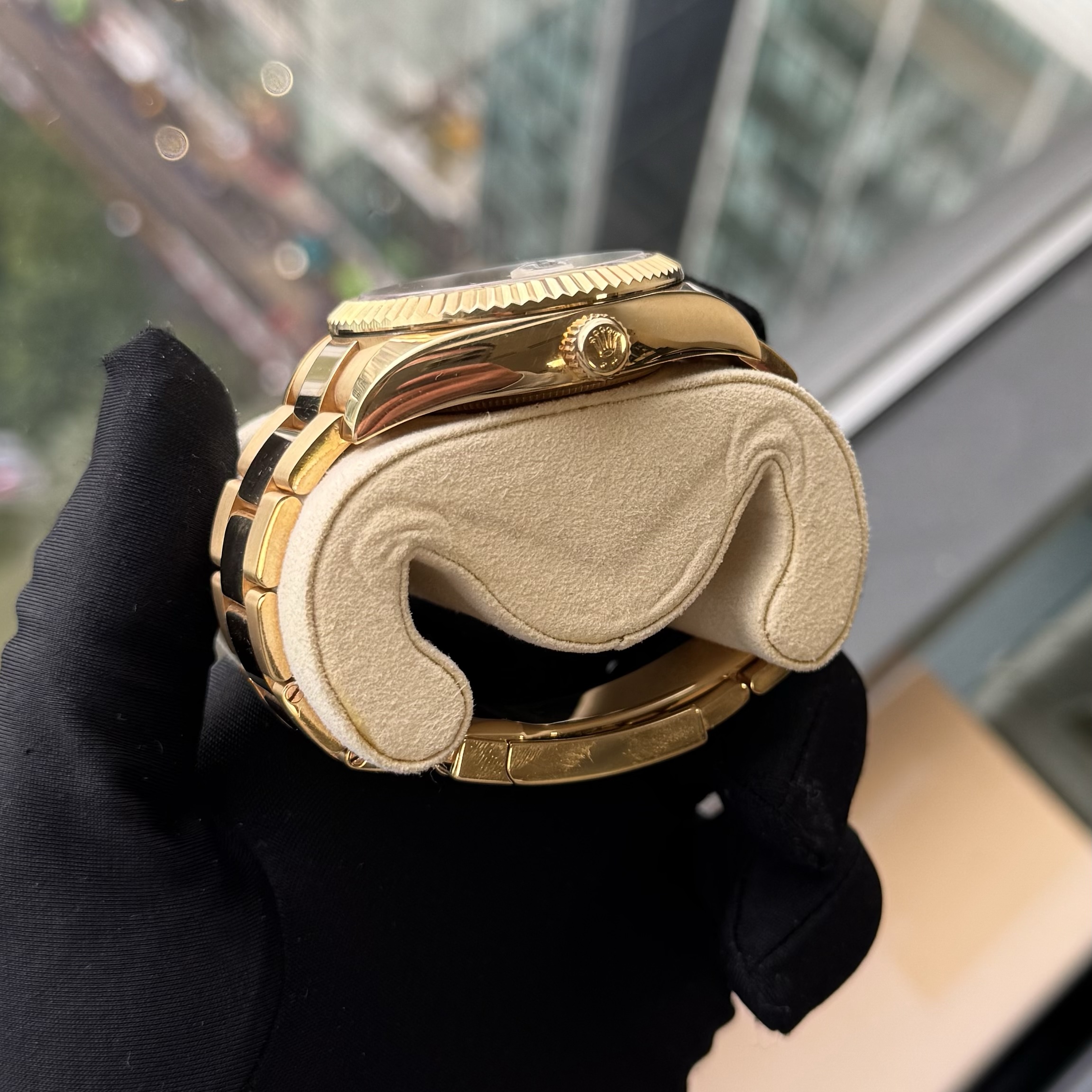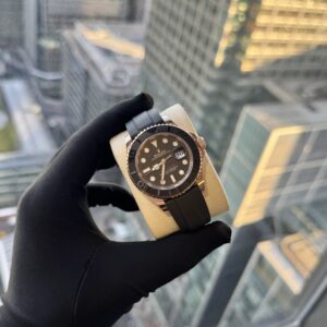 Rolex Sky‑Dweller 18 kt Yellow Gold Champagne Dial — a luxurious and highly functional travel watch that epitomizes Rolex engineering and design. Housed in a 42 mm 18 kt yellow gold Oyster case, this Sky-Dweller features Rolex’s signature fluted Ring Command bezel and a radiant sun-satin dial (often in champagne or other rich tones) that complements the warm gold finish. The watch combines an annual calendar (displaying month and date) with a dual time-zone display via an off-centre 24-hour disc — making it perfect for frequent travelers who value both sophistication and practicality. Powered by Rolex’s automatic movement with roughly 72 hours power reserve, it’s a standout piece that blends opulence with everyday reliability.
